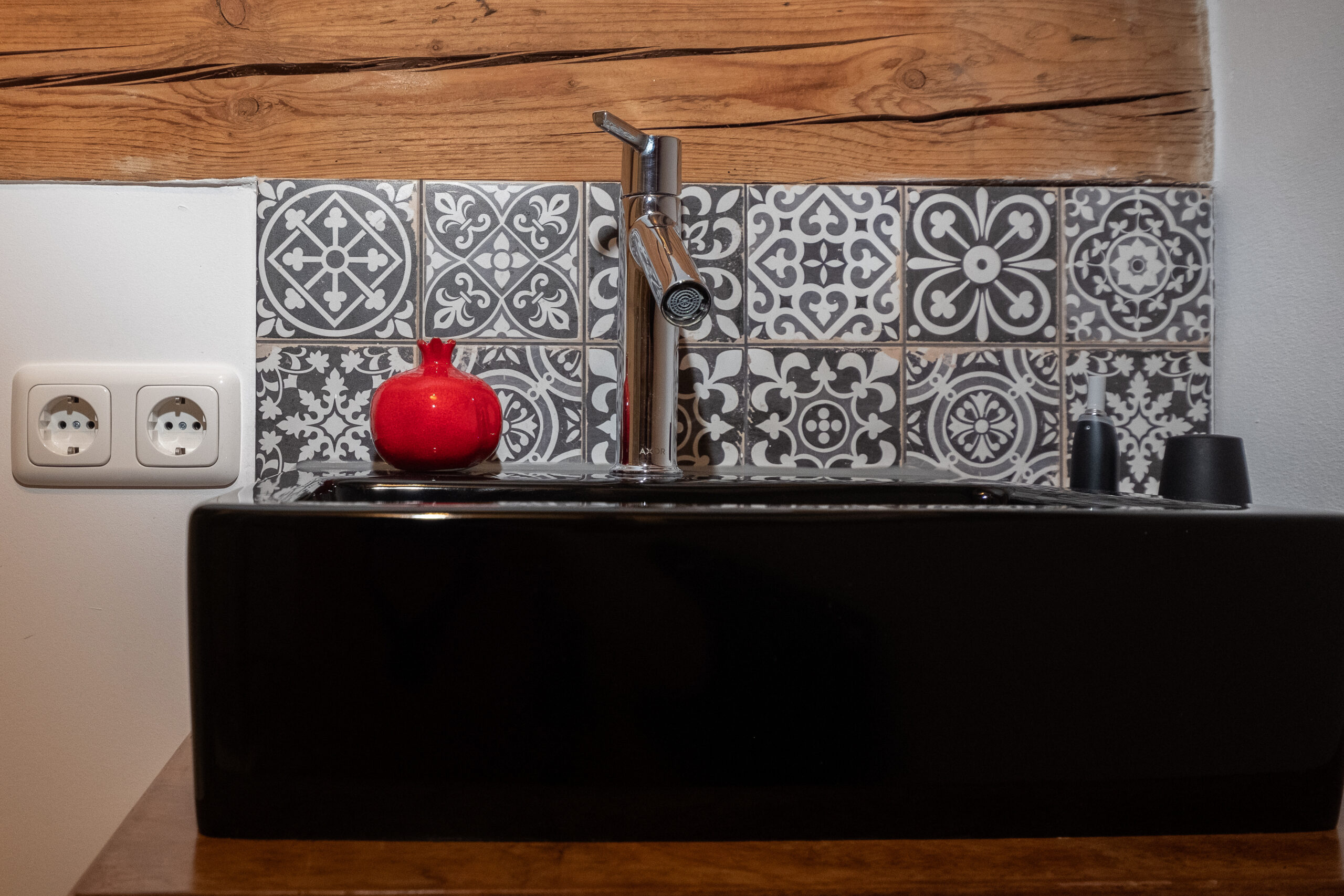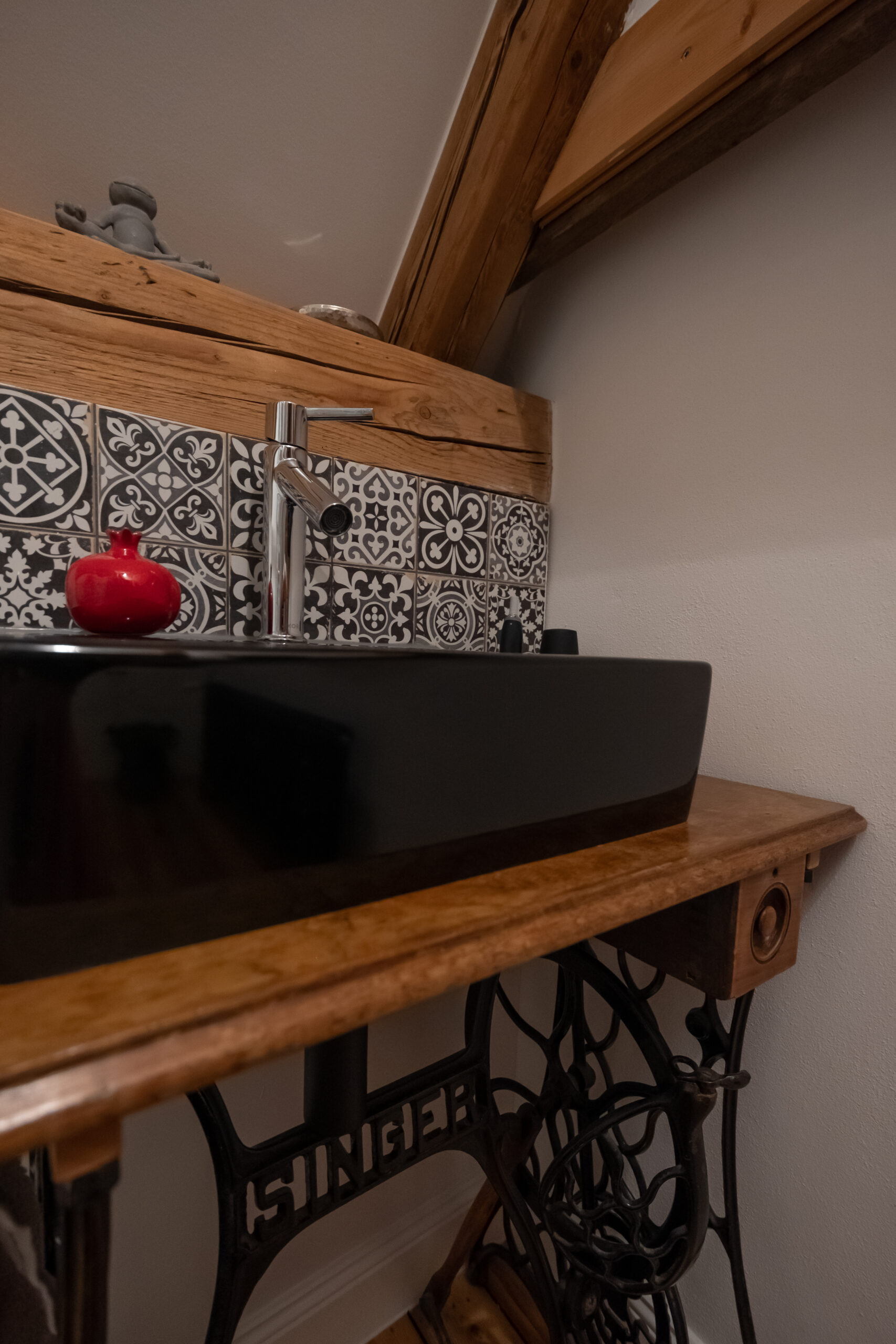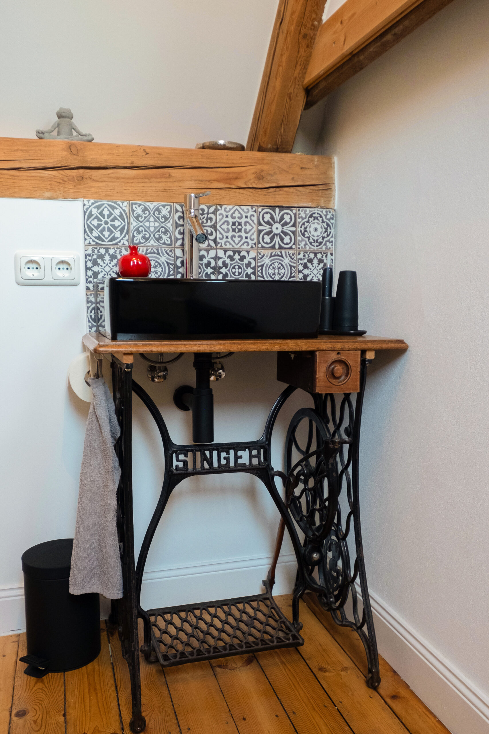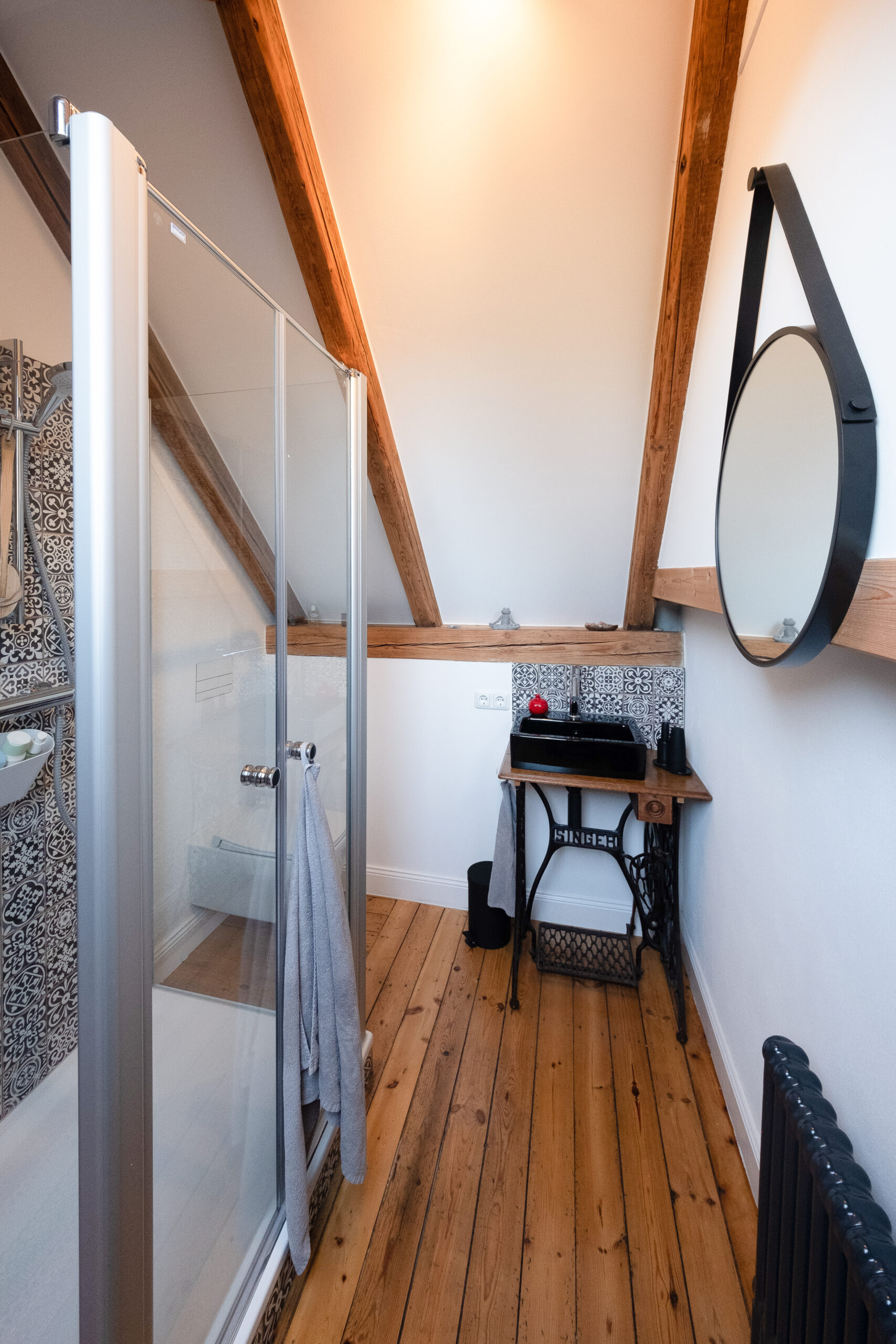 In einer Villa in Hamburg entstand im Dachgeschoss ein kompaktes Badezimmer, das den vorhandenen Raum optimal nutzt. Die Rückseite des Kamins wurde kreativ als Duschwand integriert. Ein alter Nähtisch der Großmutter erhielt als stilvoller Waschtisch ein neues Leben. Schwarze Akzente und filigrane Muster setzen elegante Kontraste und verleihen dem Raum Charakter. Minimaler Raum – maximale Wirkung.