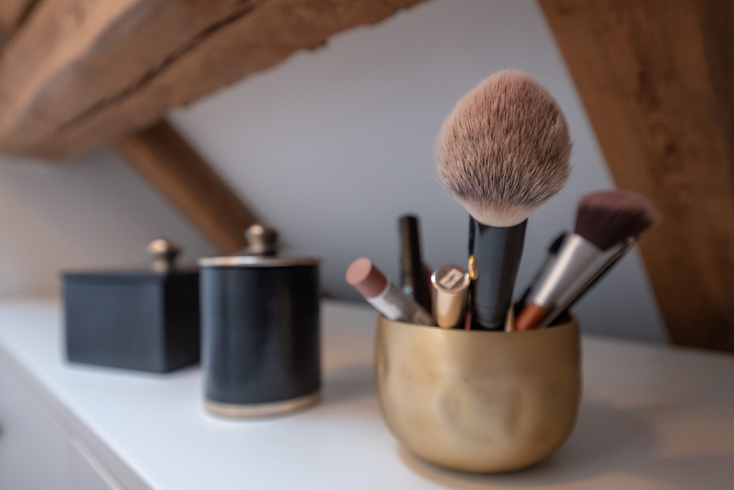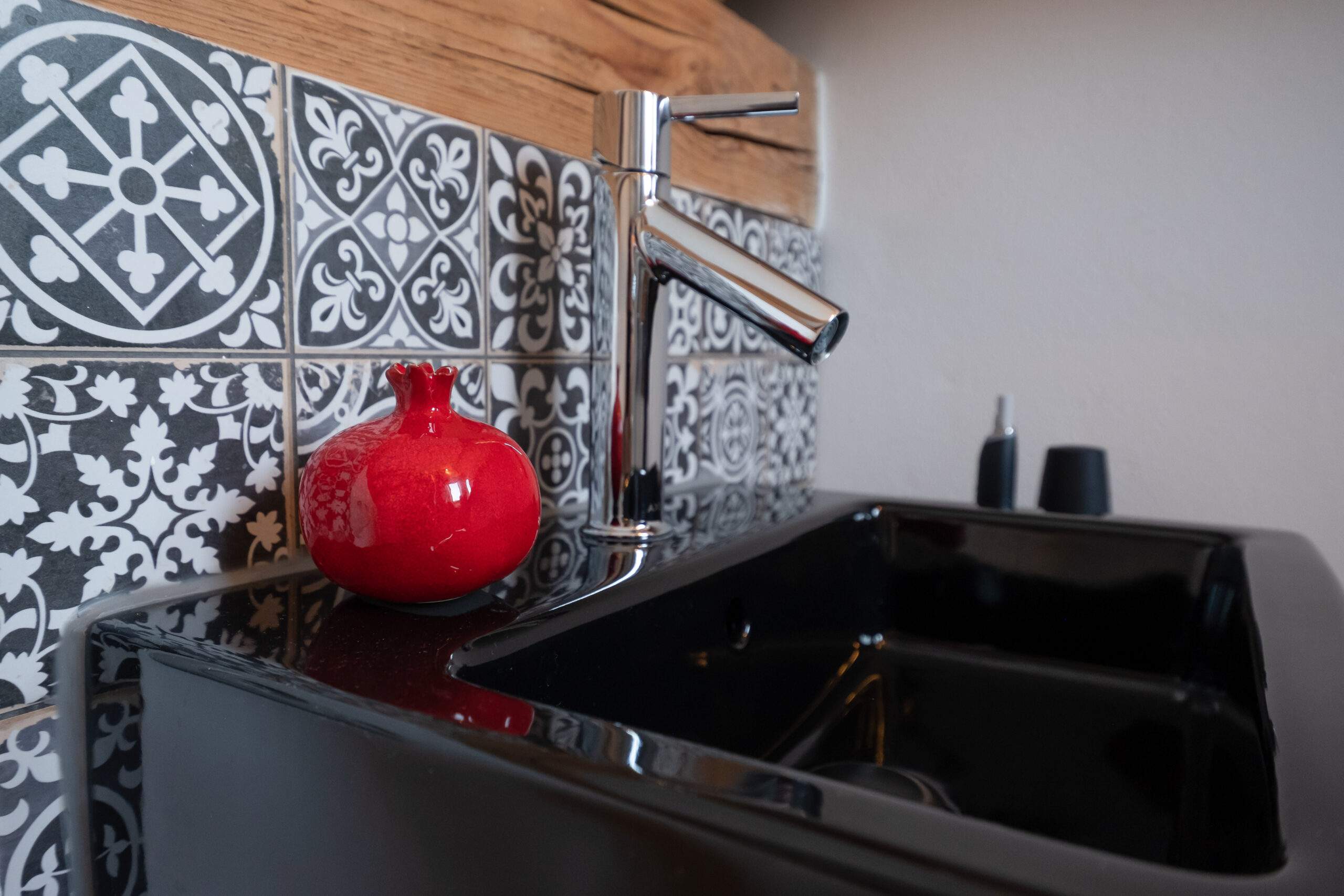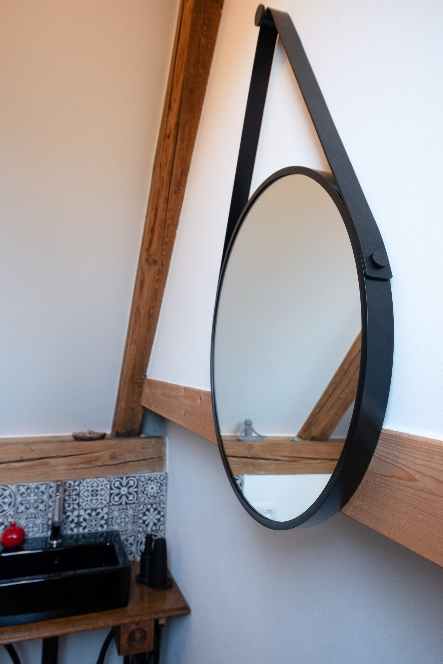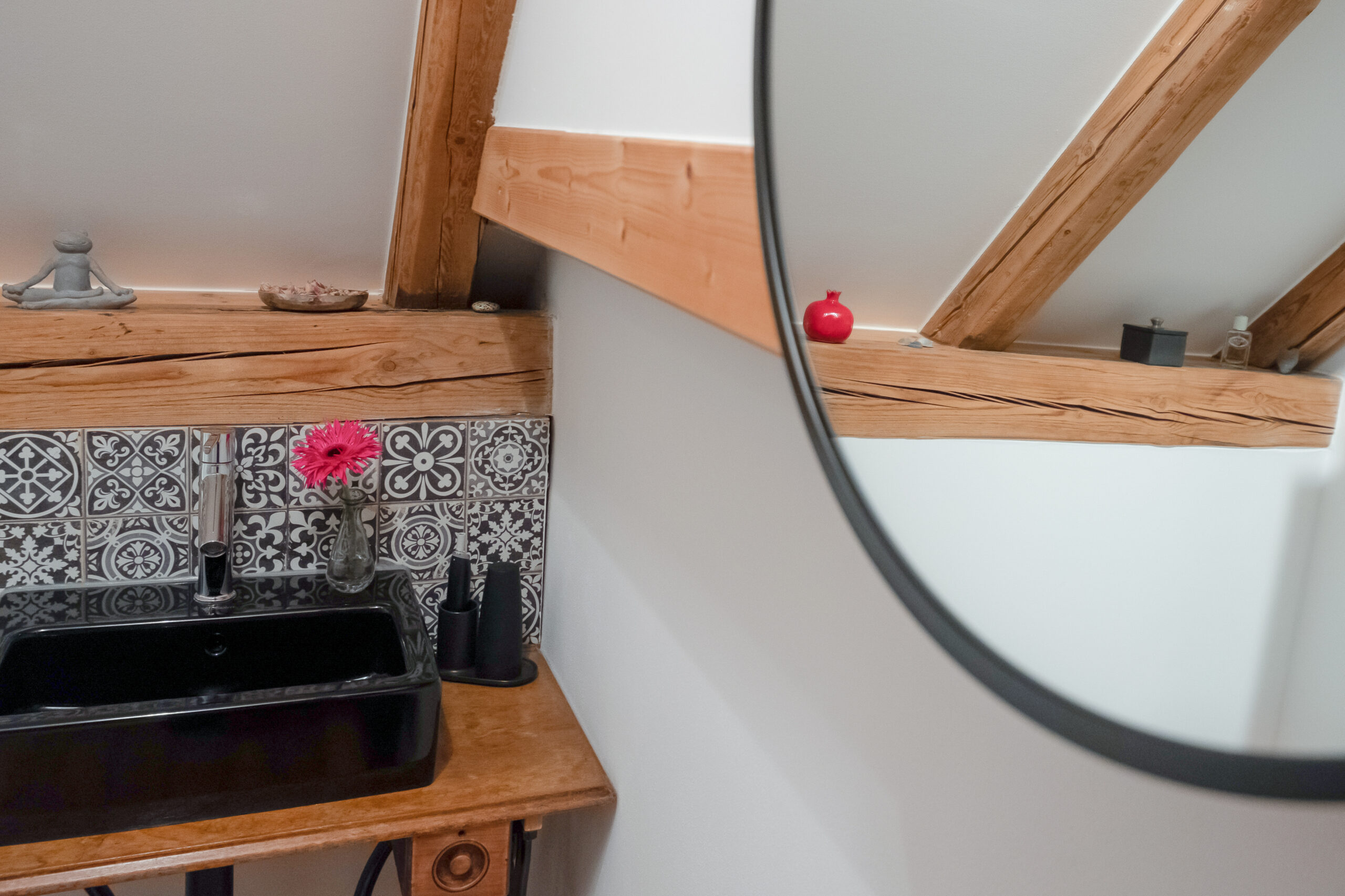 In einer Villa in Hamburg entstand im Dachgeschoss ein kompaktes Badezimmer, das den vorhandenen Raum optimal nutzt. Die Rückseite des Kamins wurde kreativ als Duschwand integriert. Ein alter Nähtisch der Großmutter erhielt als stilvoller Waschtisch ein neues Leben. Schwarze Akzente und filigrane Muster setzen elegante Kontraste und verleihen dem Raum Charakter. Minimaler Raum – maximale Wirkung.