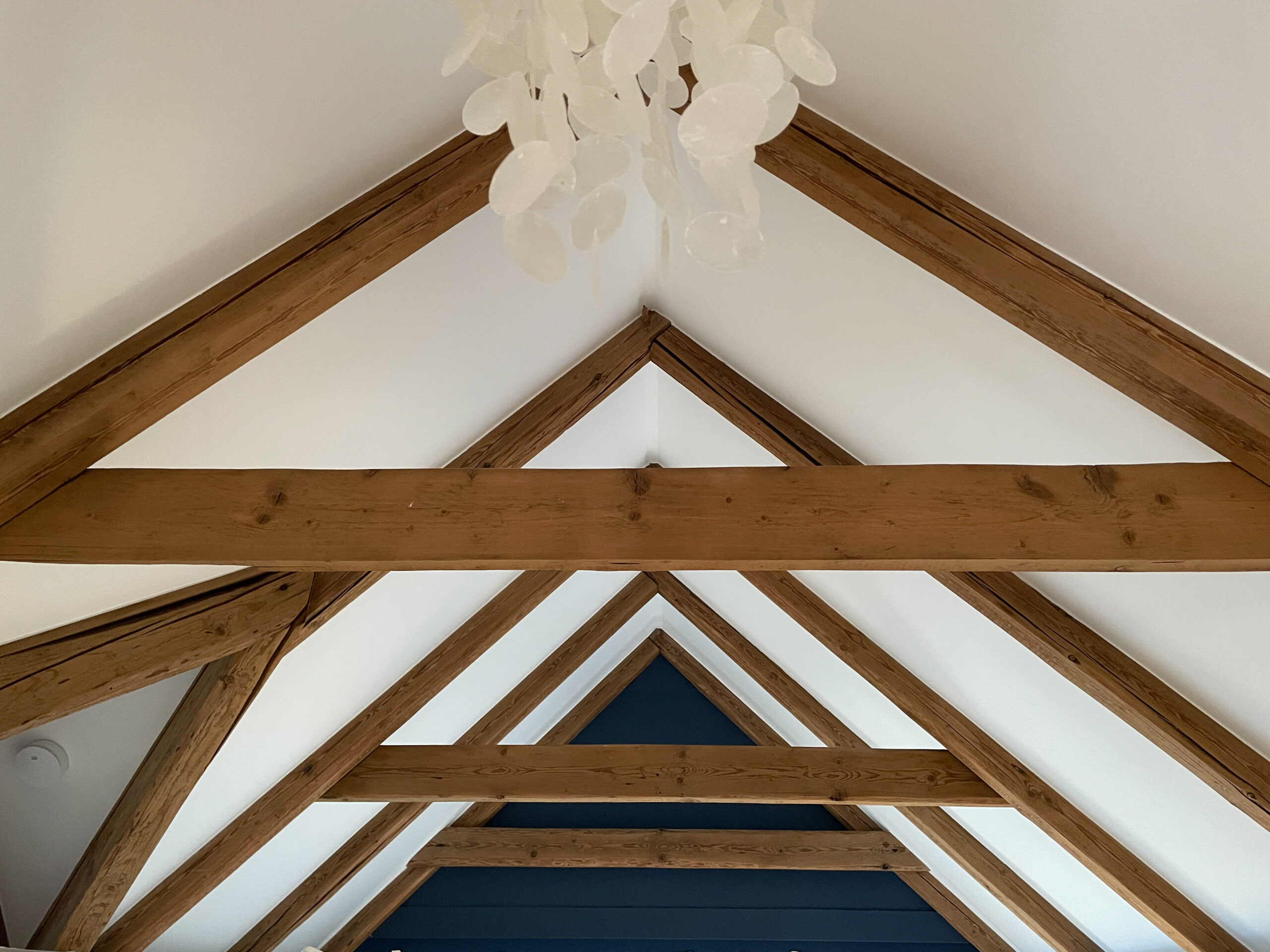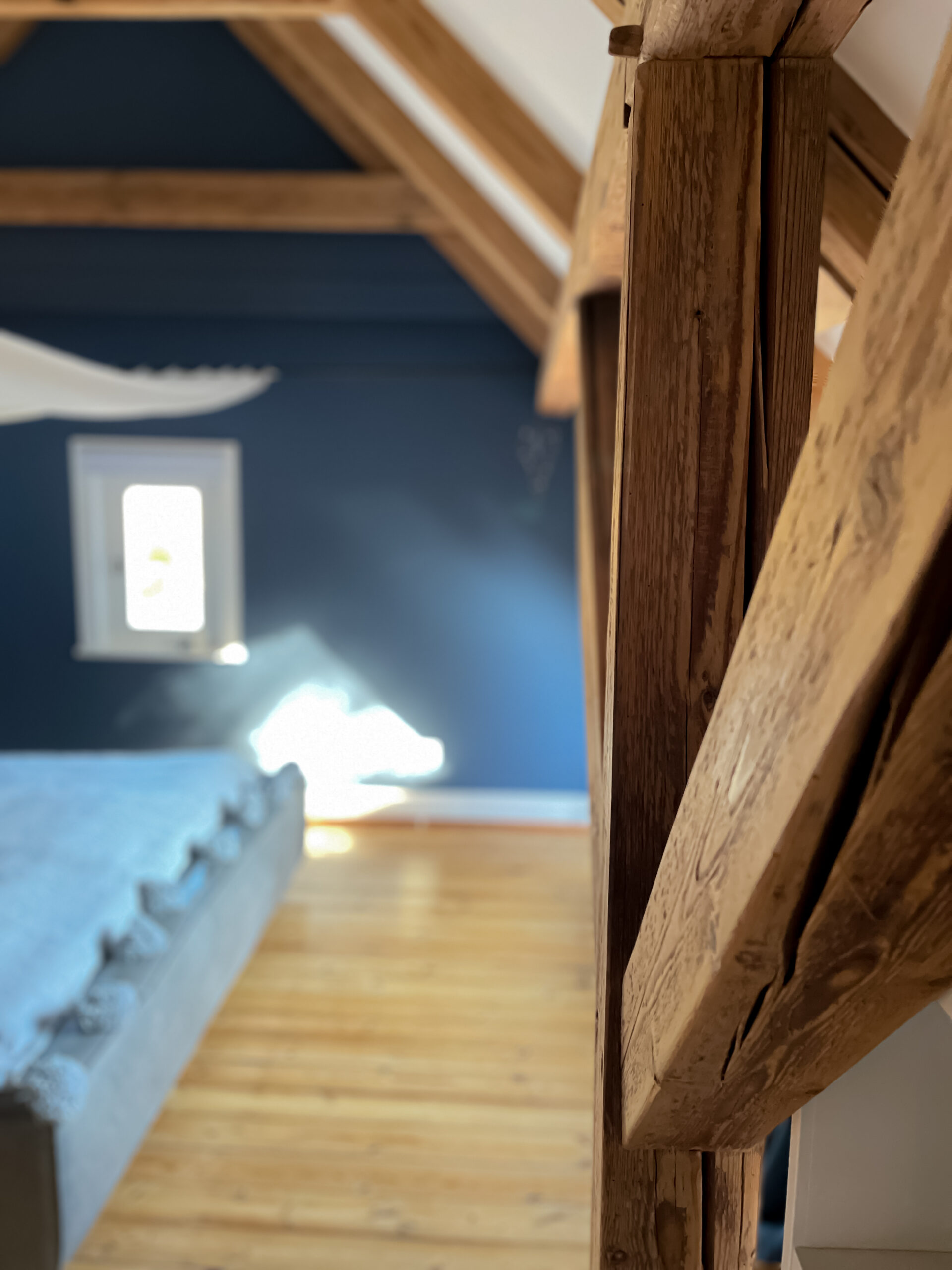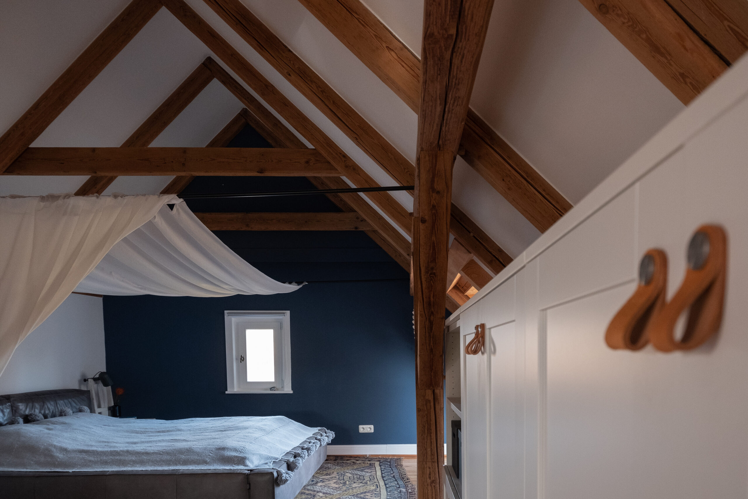 Aus einem ungedämmten, verstaubten Dachboden entstand in Hamburg durch eine umfassende Sanierung ein gemütliches Dachgeschoss mit historischem Charme. Die freigelegten Holzbalken und der originale Holzfußboden aus dem Jahr 1913 verleihen dem Raum Charakter und erzählen die Geschichte des Hauses. Das durchdachte Farbkonzept schafft eine harmonische Verbindung zwischen Alt und Neu. Im Schlafzimmer sorgt der Stoffhimmel über dem Bett für Geborgenheit und Leichtigkeit. Ein Bad mit individuellen Details ergänzt den neuen Wohnbereich. So wurde aus ungenutztem Speicherraum ein Ort der Ruhe, der durch sorgfältige Planung und viel Liebe zum Detail entstand.